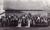 | Grammen 026 - Goldene Hochzeit Gottlieb und Gottliebe Fomferra geb. Nowack, 1938. Das Bild zeigt das Goldpaar mit sieben ihrer acht Kinder. Die Tochter in der Mitte der oberen Reihe ist die Mutter von Frau Becker geb. Dominick Friederike Fomferra im Alter von 29 Jahren. |