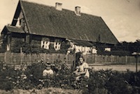 | Groß Schiemanen 035 - Vor dem Haus Badorrek, 1942. Kurt Gayk, Gudrun Schmidt aus Königsberg, Margarete Blum, Kindergärtnerin aus Friedrichshof, Gerda Stumm Abel, Brunhilde Badorrek Mosel und Waltraud Plewka Tietz. |