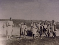 | Schobensee 007 - Kindergruppe, ca. 1938. Von links: der große Junge Siegfried Nispel. Die Mädchen in den gepunkteten Kleidern sind Hannelore und Irmtraut Botsch. In der Mitte bzw. links: die beiden Schwestern von S. Nispel Elisabeth und Ursel. Zwei Jungens von Brosch Helmut und Achim. Rechts: A. Klaperski. Ein Ort am Schobensee zwischen Mensguth und Ortelsburg. |